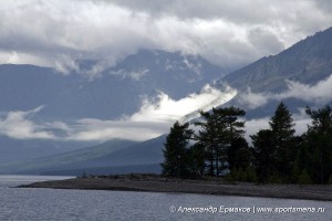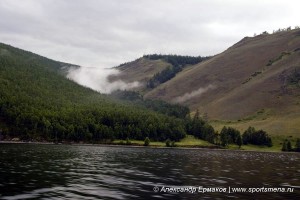 Ухожу на другую сторону мыса и мне открывается замечательная картина. Отроги Байкальского хребта спускаются прямо в Байкал, а вершины упираются в грозные тучи. Посредине склона висит туча подсвеченная лучом солнца, прорвавшемся через толстый слой туч.