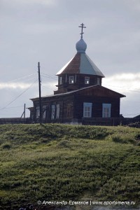 А вдалеке уже виден мыс Лударь. Подходим к причалу и чалимся. На берегу весьма оживленно. Постоянно подъезжают машины и мотоциклы с прицепами на которых катера. Шустро разворачиваются и пятясь загоняют прицеп в воду. Катера всплывают и прицепы вытягивают обратно на берег. Наверное вся деревня поехала ставить сети. Иван ушел провожать студентов, а я стою и слежу за моторкой. Прямо напротив пристани, на горочке, стоит деревянная часовенка. Видимо про эту часовенку писал Э. Бутаков в своей книжке.